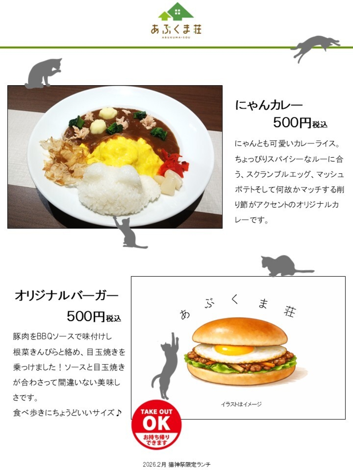 いつもあぶくま荘をご愛顧いただきまして、ありがとうございます。 2月21日(土)・22日(日)は丸森 猫神祭です。 ランチメニューに、「にゃんカレー」・「オリジナルバーガー」が限定メニューとして登場 します。ご来館をお待ちしております。 あぶくま荘レストラン:11:30~15:00(14:30ラストオーダー)